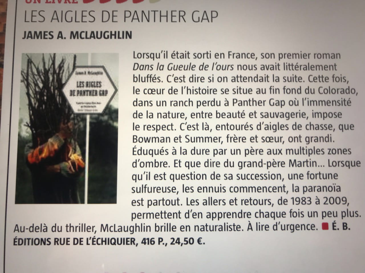 « Dans la plus pure tradition américaine du nature writing, James McLaughlin répond par un polar vibrant, intense et musclé, peuplé de personnages complexes et profonds. Une immersion vertigineuse dans ce que la nature et les hommes ont de plus sauvage. Subtil et flamboyant ! »