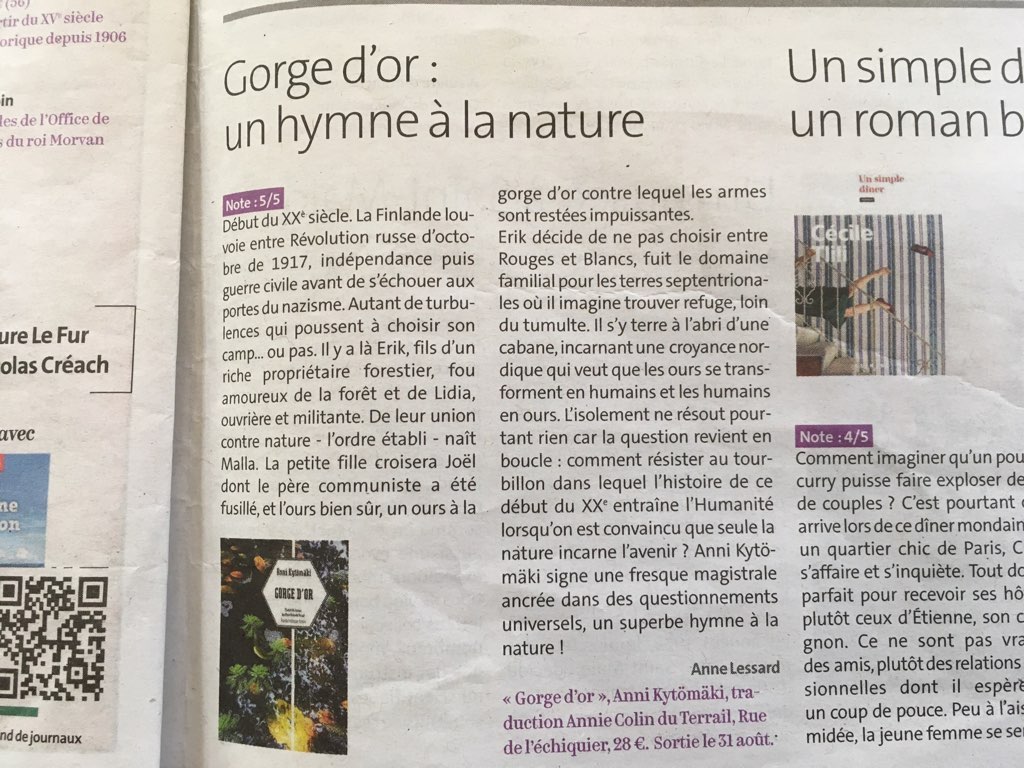 « Gorge d’or est l’un des plus fascinants romans qu’il m’ait été donné de traduire. Au-delà d’une captivante saga familiale teintée de réalisme magique et d’un plaidoyer pour le respect des espaces naturels, et avant tout de la forêt, ce roman reflète l’âme même de la Finlande. »