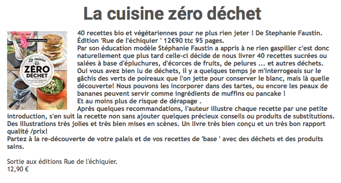 Je vous recommande ce livre qui vous permettra de joindre l’utile à l’agréable. Il peut aussi constituer un sympathique cadeau à quelqu’un qui aime cuisiner et se préoccupe de l’environnement !
